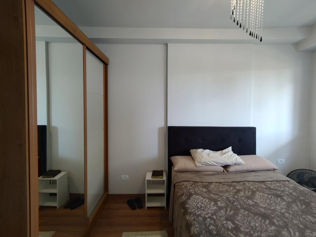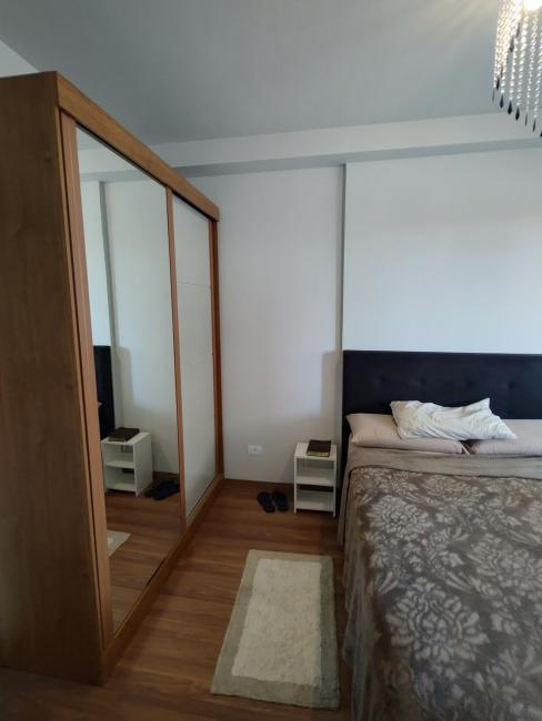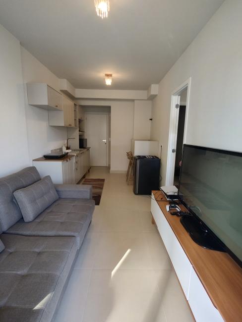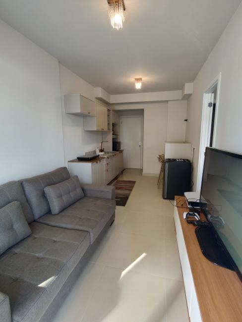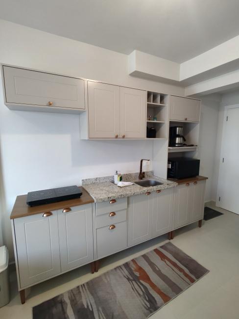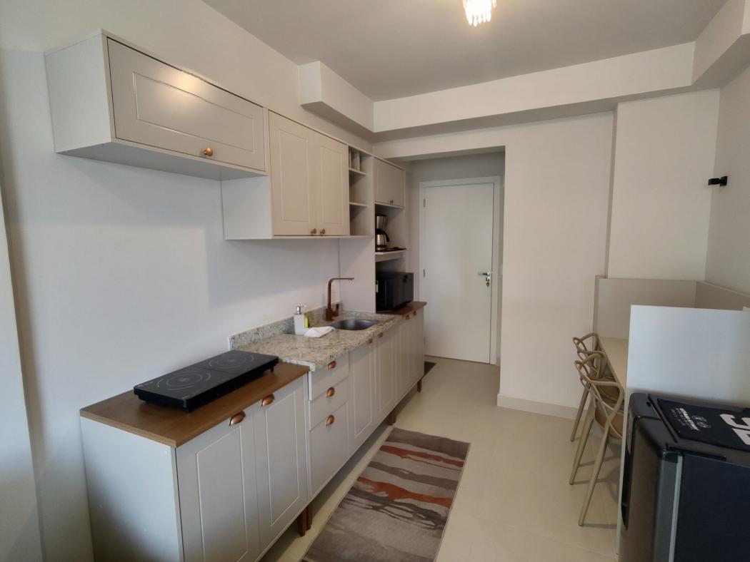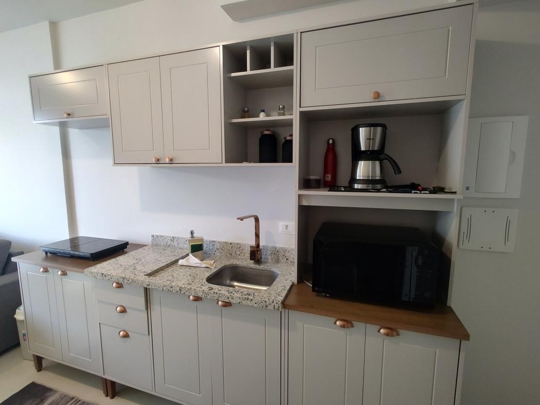 Sofá, hack, tv, cooktop de indução, frigobar, cama, armários na cozinha, armários no quarto.
