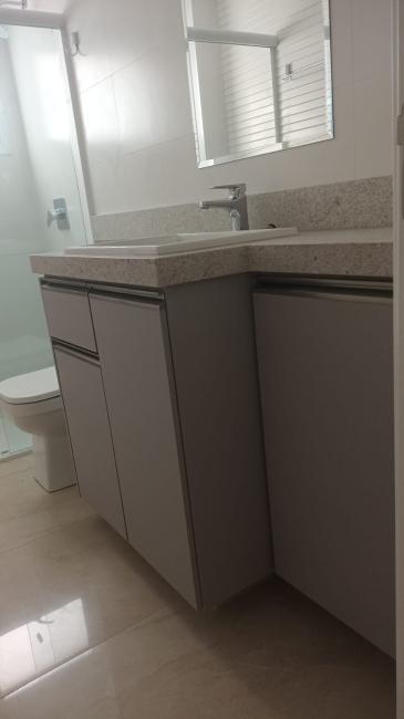 Banheiro: Armário com bancada de granito, Box em vidro temperado, Espelho na área do lavatório, Ducha aquecimento a gás.