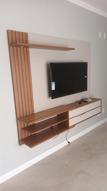 Sala de Estar e Jantar: TV 41 polegadas fixada em painel decorativo, sofá bipartido, cortinas (tecido), sacada com churrasqueira.