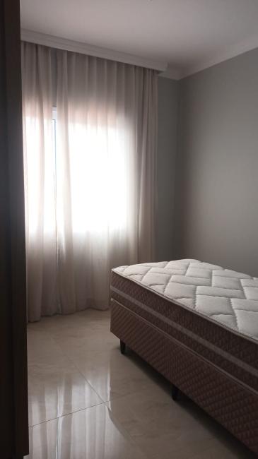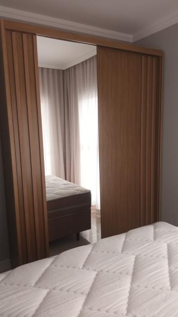 Quarto Principal: Cama box de casal com painel de cabeceira, Colchão, Guarda-roupas, Cortinas, sacada.