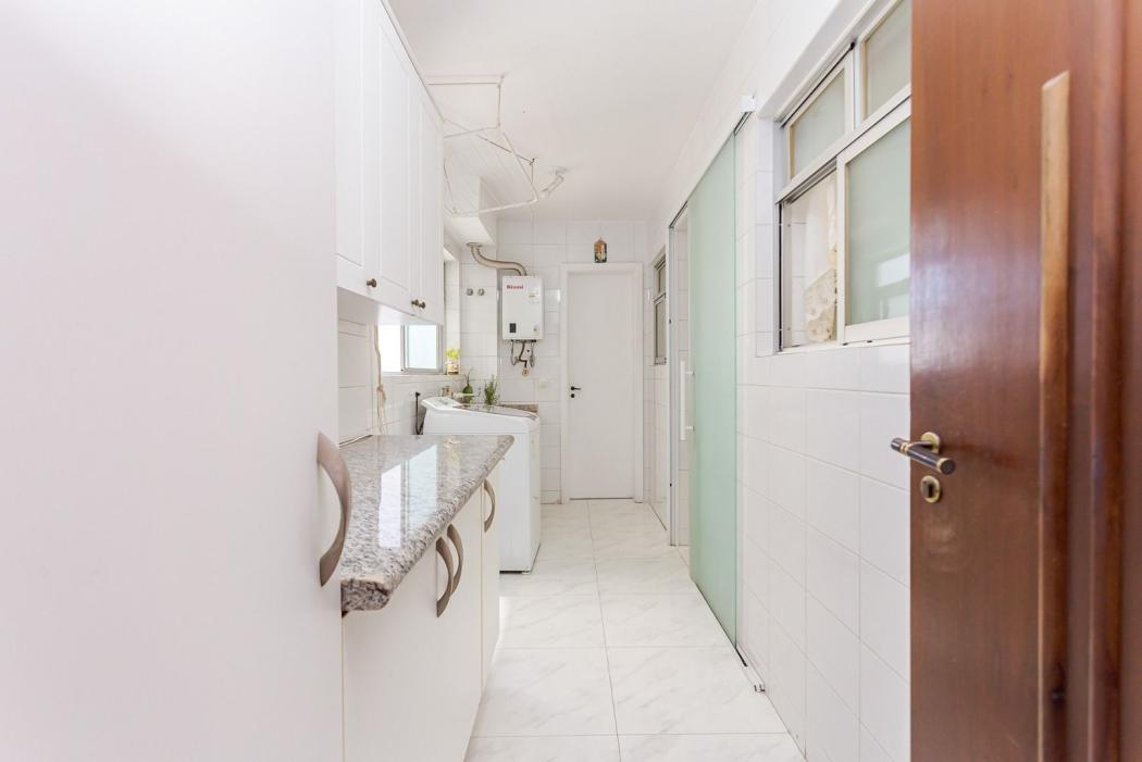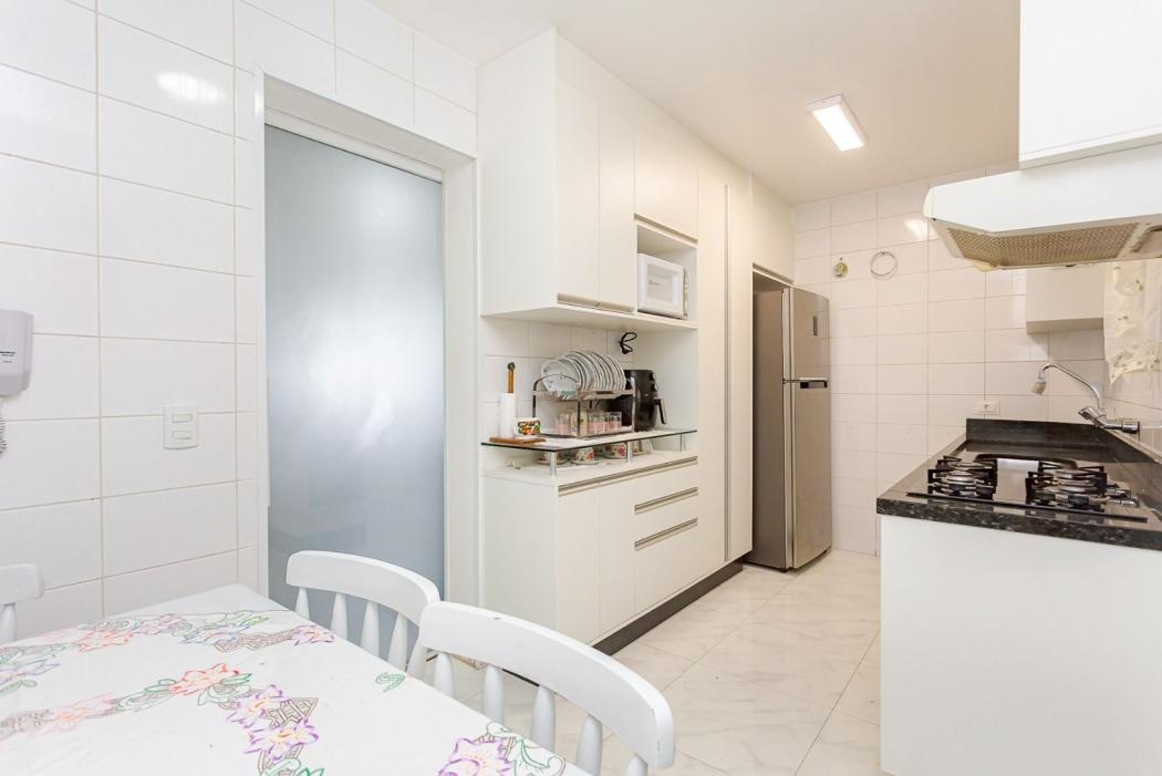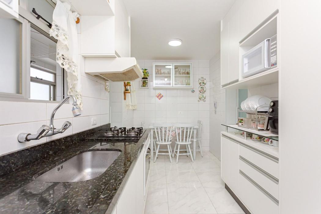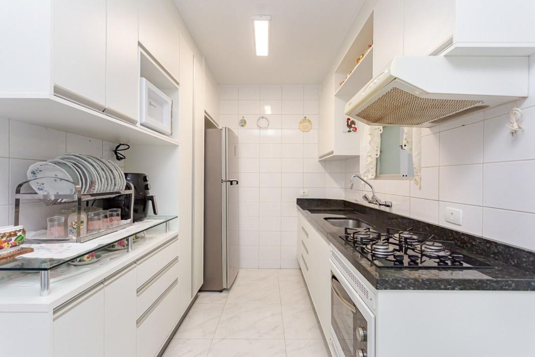 Cozinha com armários planejados e tampo em granito, além de dependência de empregada com banheiro.