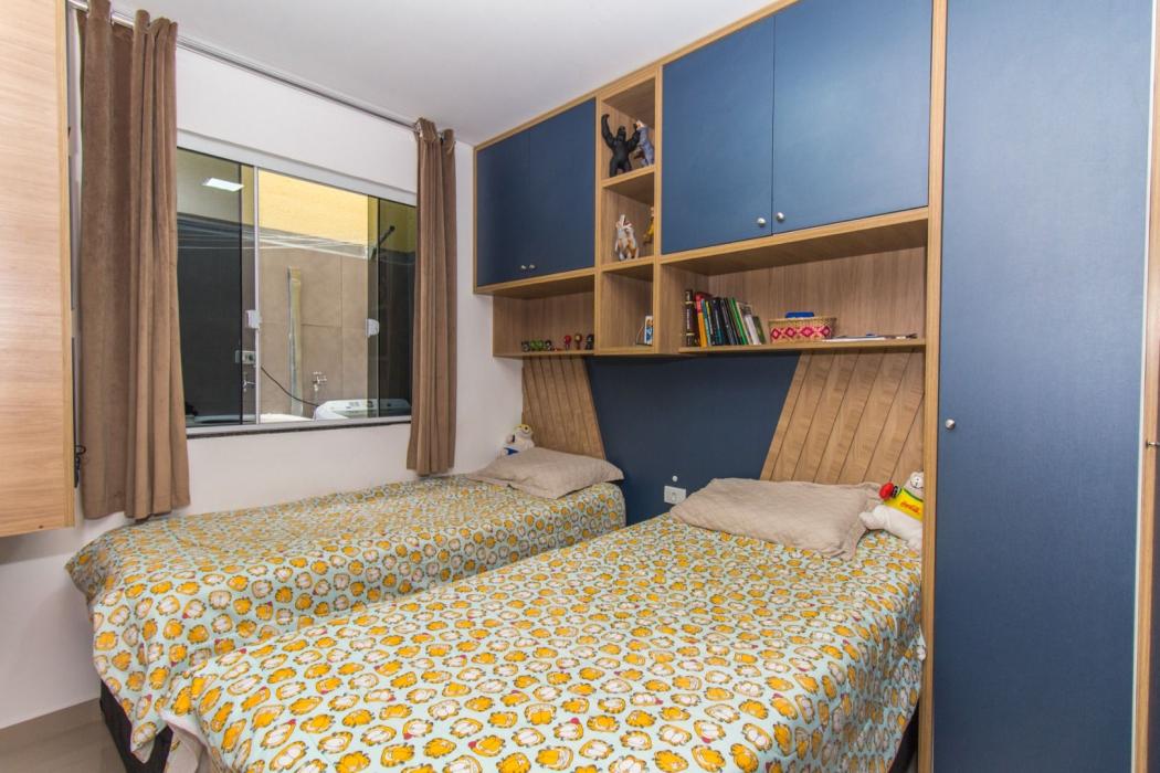 A casa dispõe de cozinha com armários planejados, banheiros com armário, espelho e box em vidro, piso porcelanato em todo o imóvel, dois dormitórios principais com móveis planejados.