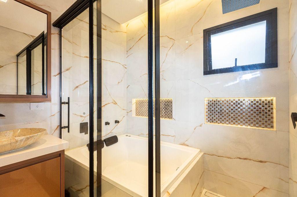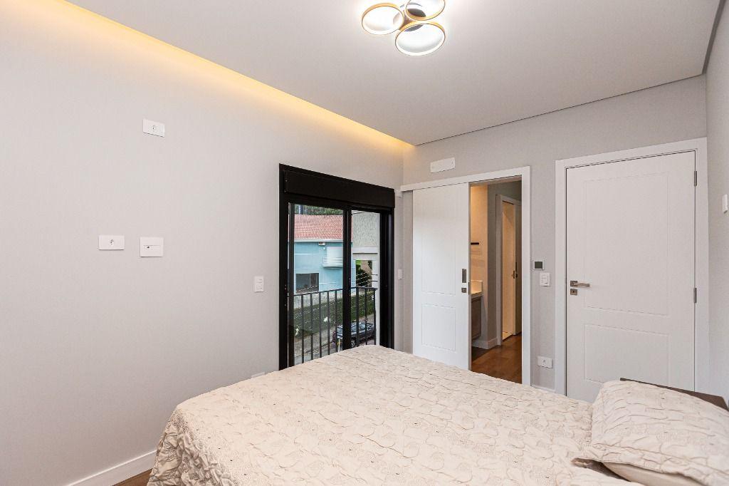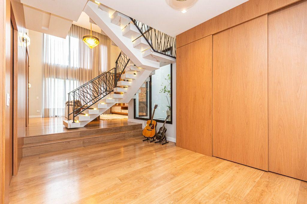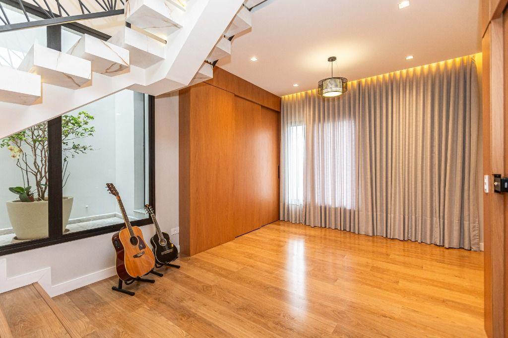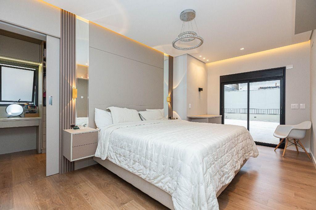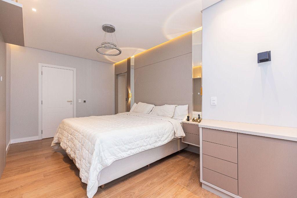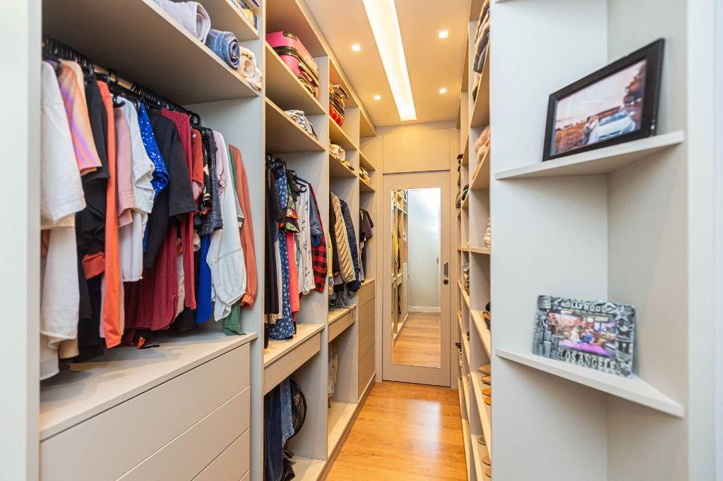 São 4 quartos, sendo uma suíte no andar inferior, uma suíte máster e mais uma Demi-suíte no andar superior, sendo a máster, com closet e hidro, que se abre para uma linda varanda, super ensolarada, todos com armários e piso aquecido nos banheiros e quartos.