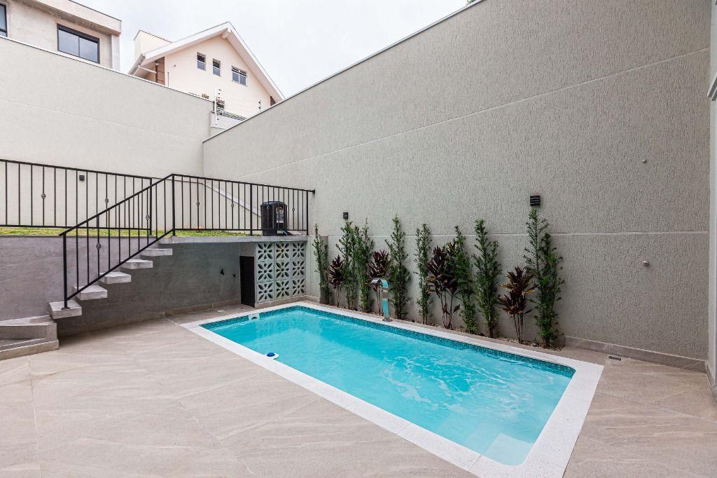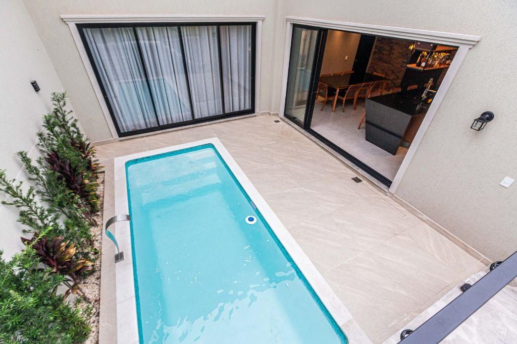 Piscina aquecida, amplo terraço, com área verde e grama nos fundos.