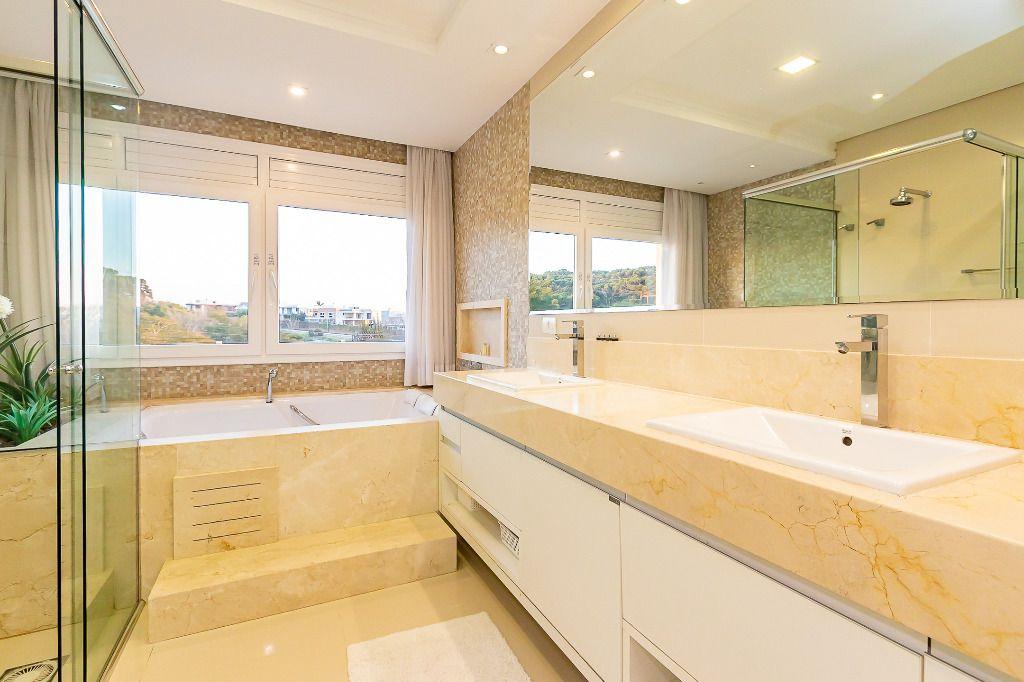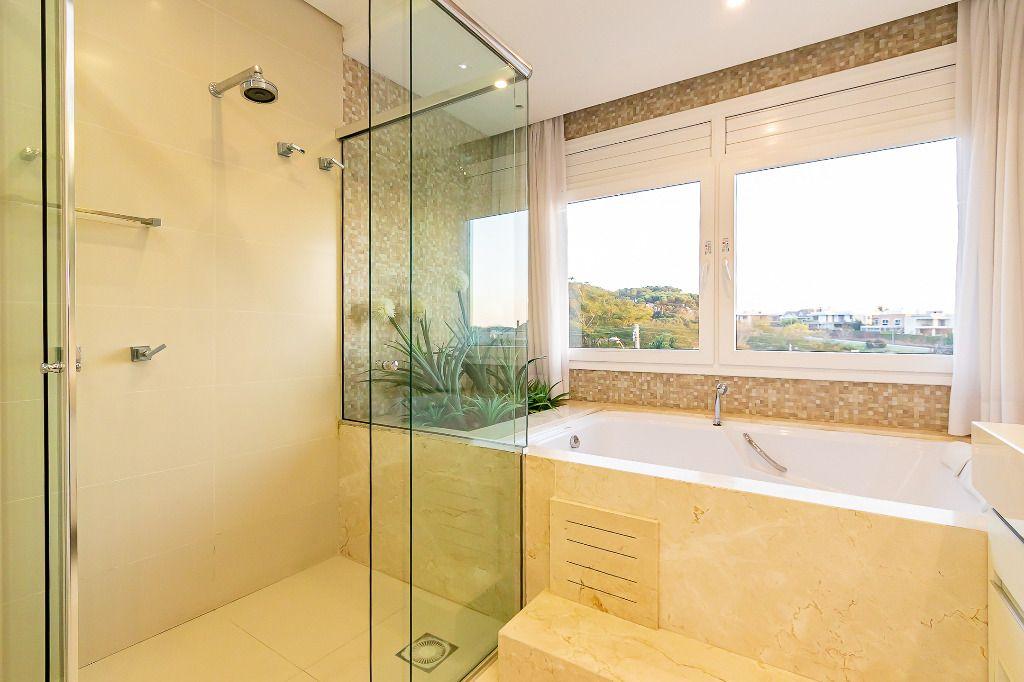 - Banheiro da suíte principal com hidromassagem e vista para o lago;