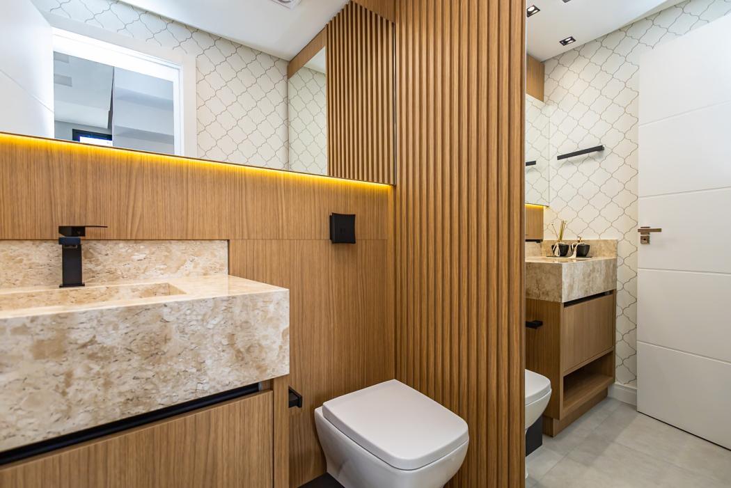 - Banheiro social com pia esculpida em mármore, louça moderna, piso aquecido, ducha higiênica, box e metais instalados