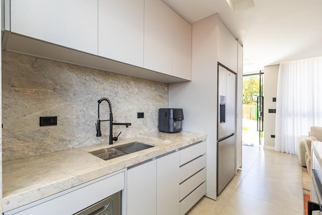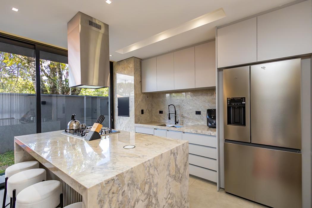 - Cozinha com ilha e churrasqueira em conceito aberto toda mobiliada e equipada com lava louças, microondas, forno, fogão e coifa