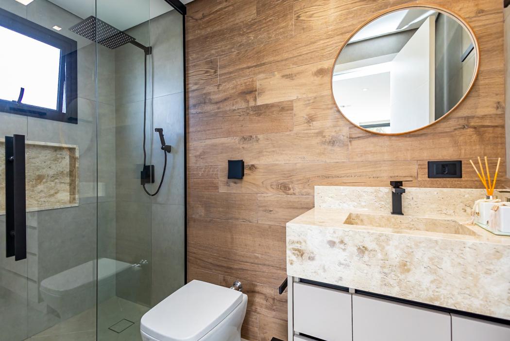 - Banheiro suíte com pia esculpida em mármore, piso aquecido, ducha higiênica, banco de sauna com led, box e metais instalados
