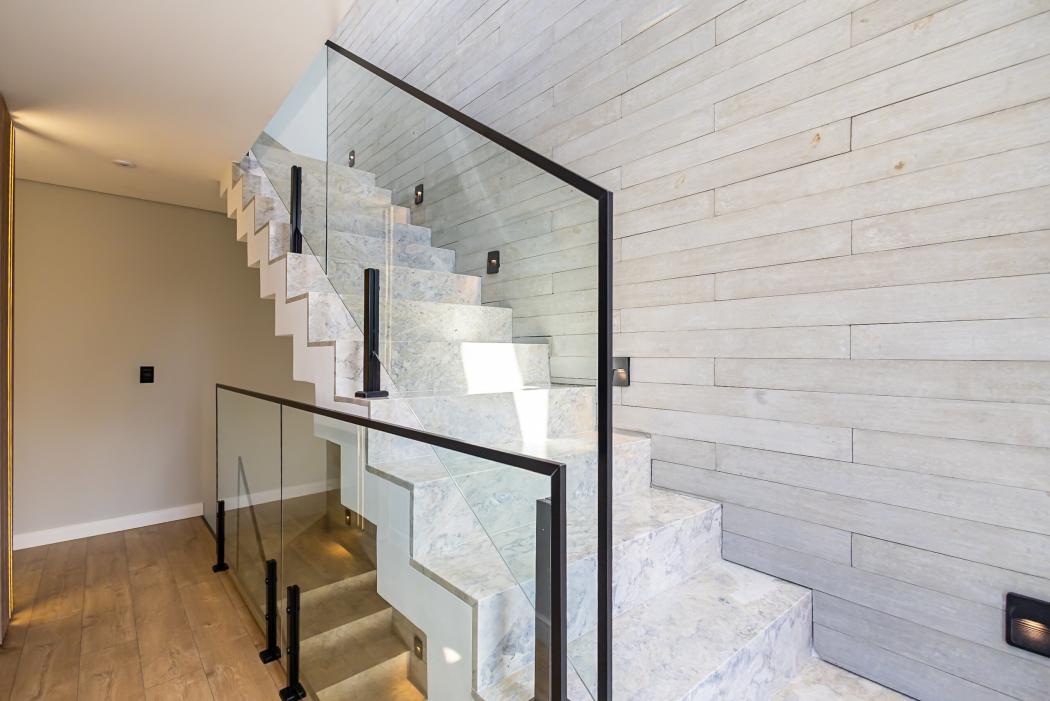 - Escadas com revestimento em Granito e guarda-corpo de vidro e moldada degrau a degrau