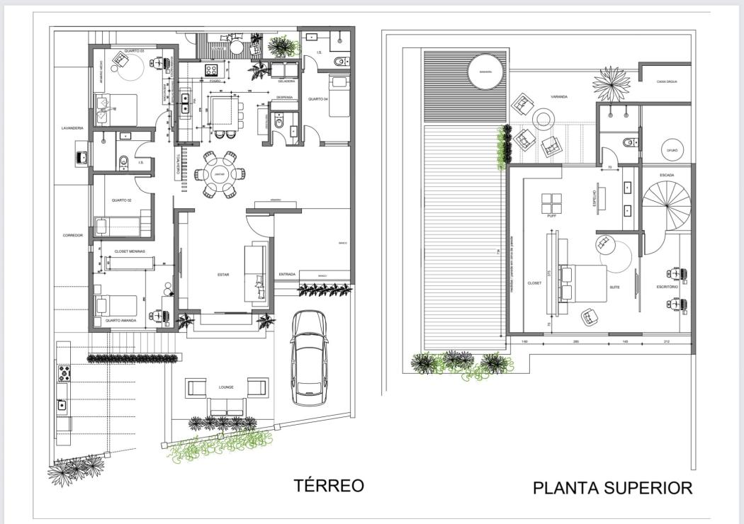 No pavimento superior, a área íntima é bem resolvida e organizada. A suíte master conta com closet e espaço para escritório, atendendo perfeitamente quem trabalha em casa. Há ainda um setor privativo com três dormitórios, banheiro próprio e closet compartilhado, solução prática para famílias maiores.