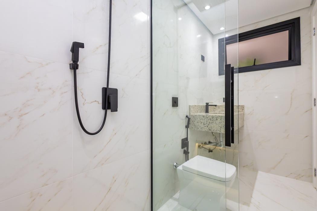 - Banheiro social com pia esculpida em mármore, louça moderna, piso aquecido, ducha higiênica, box e metais instalados