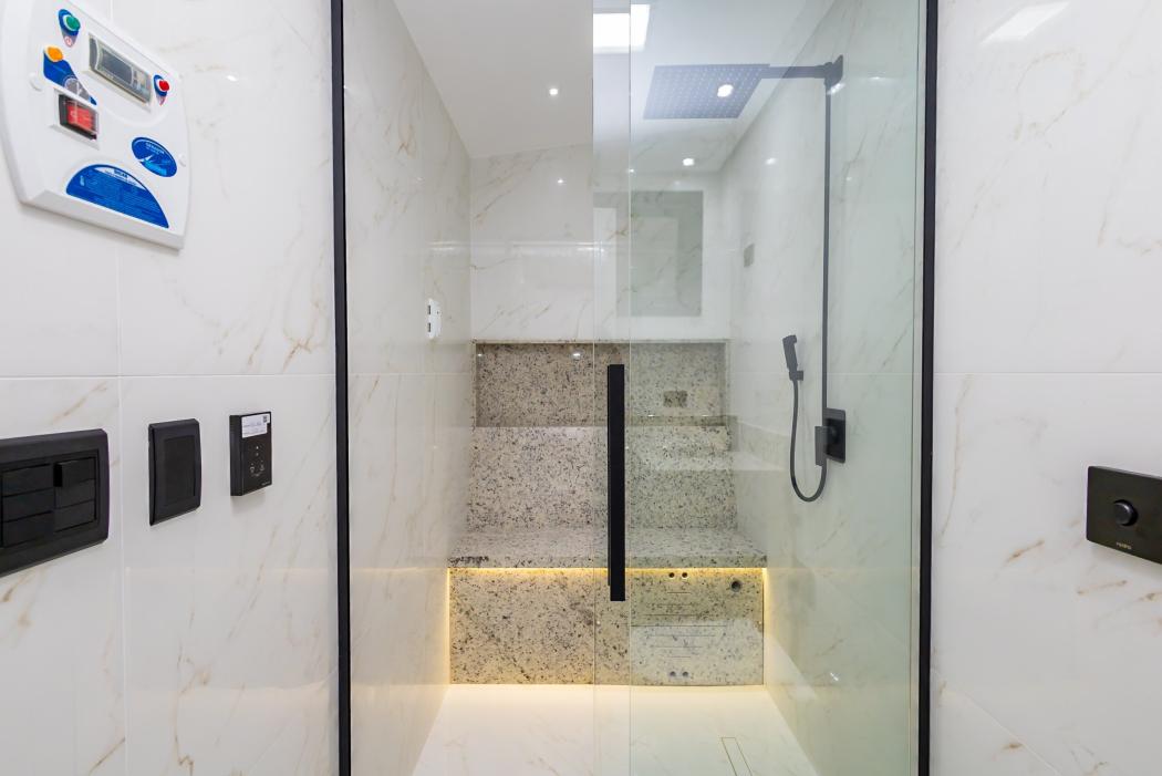 - Banheiro suíte com pia esculpida em mármore, piso aquecido, ducha higiênica, banco de sauna com led, box e metais instalados