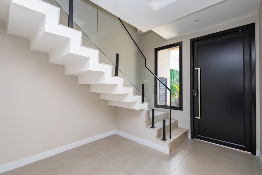 - Escadas com revestimento em Granito e guarda-corpo de vidro e moldada degrau a degrau