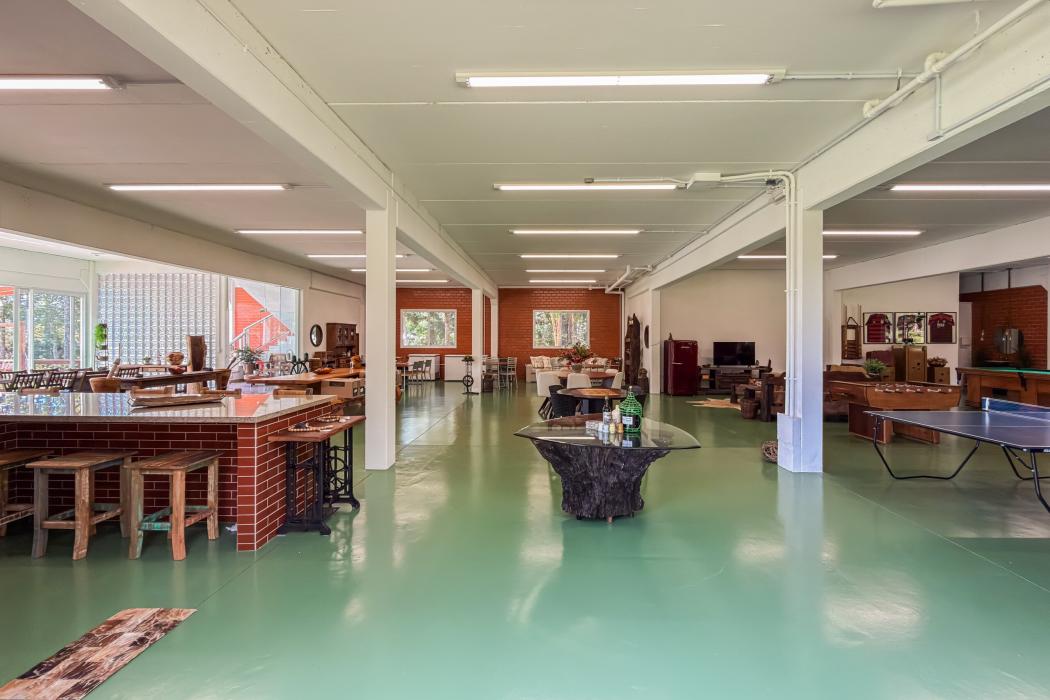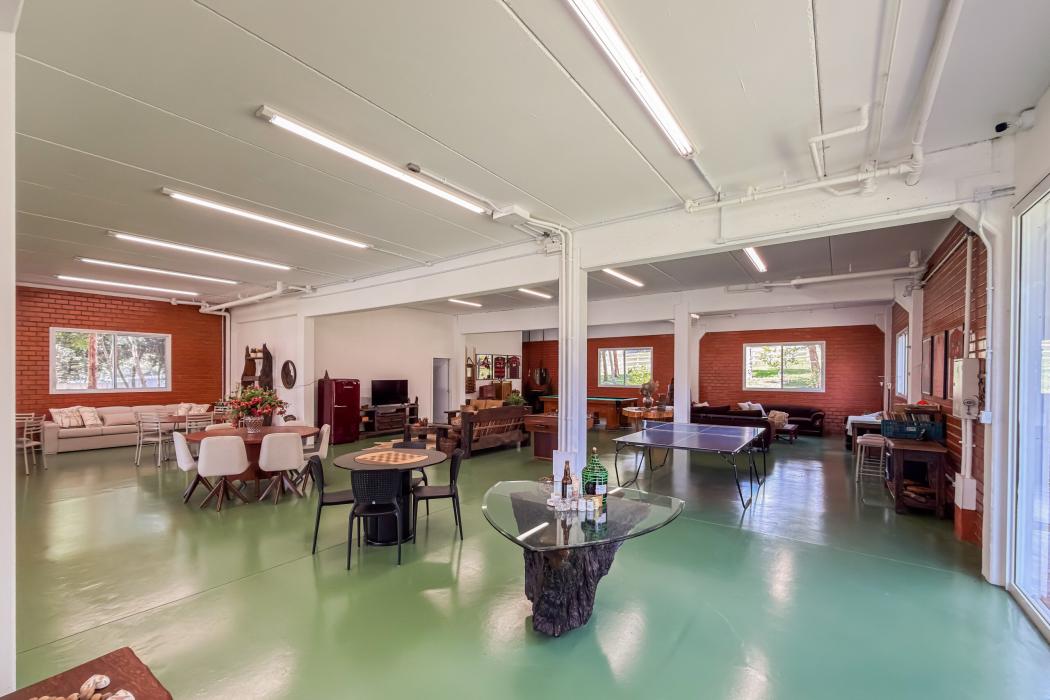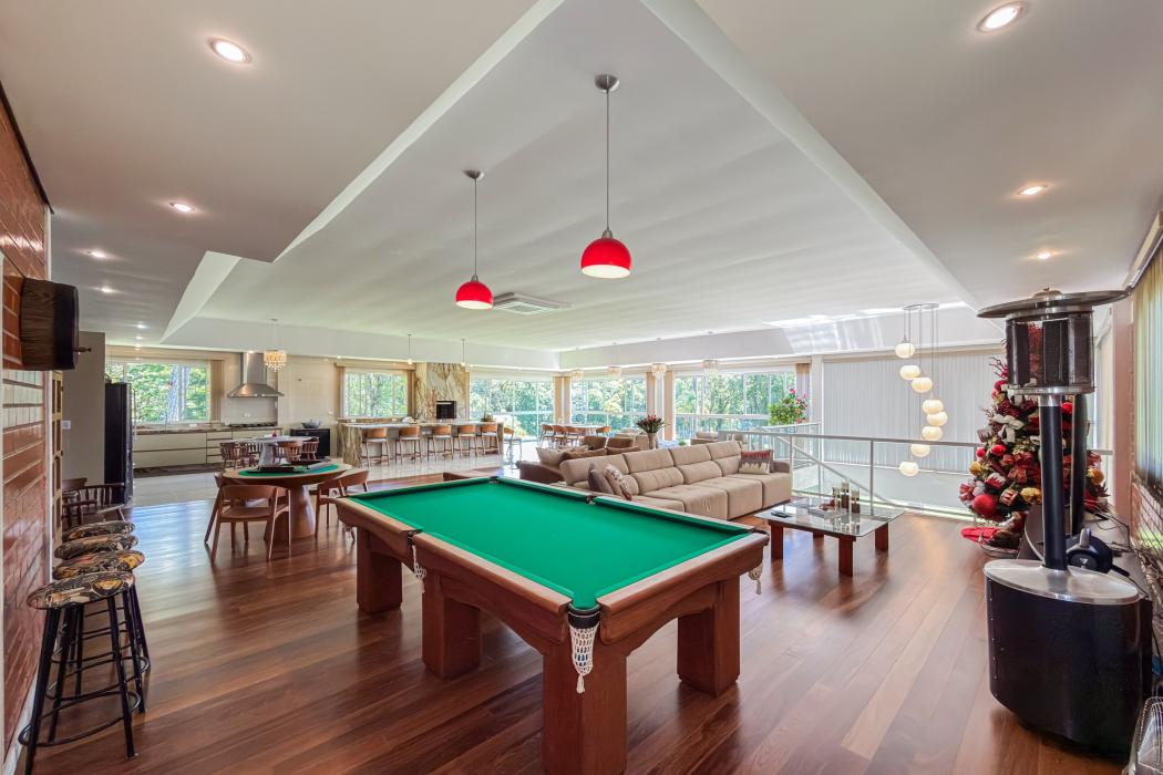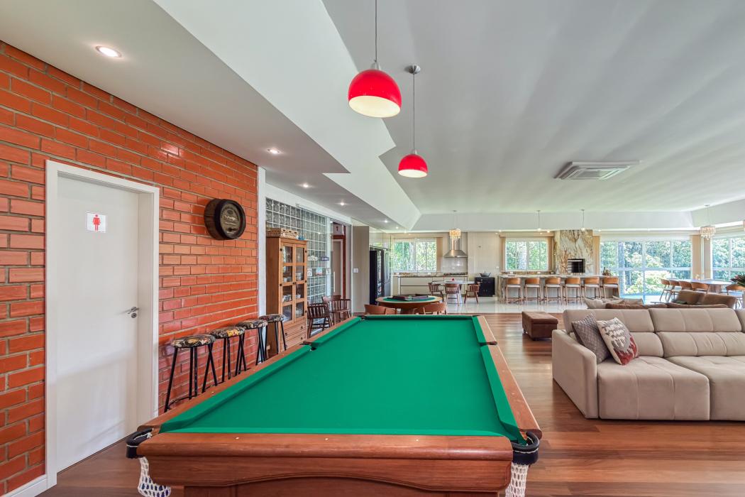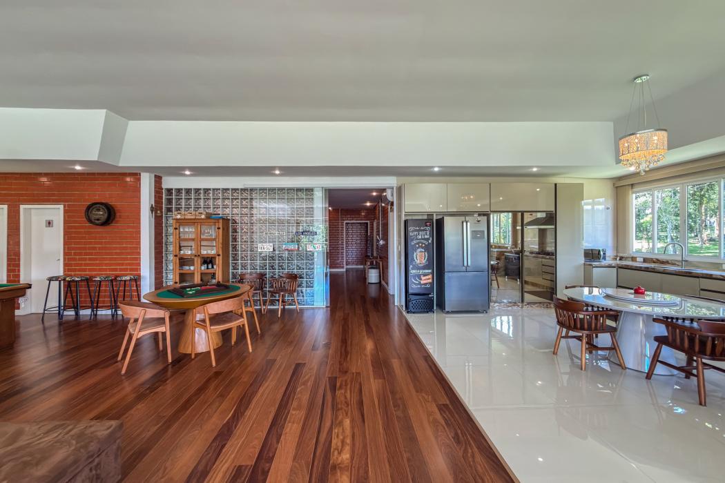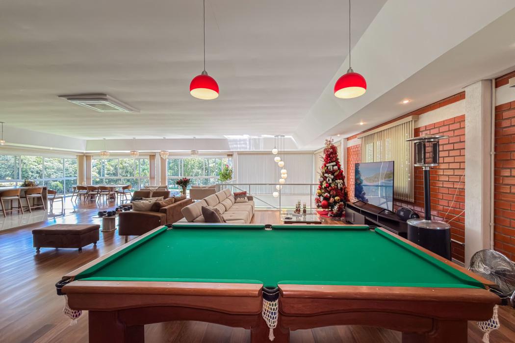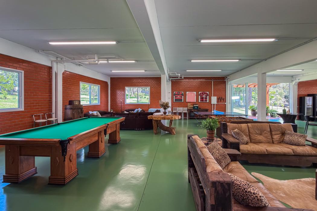A área de lazer principal, no pavimento inferior, foi projetada para receber em grande escala. Conta com espaço gourmet com churrasqueira, salão amplo integrado, mesas de sinuca, ping-pong e jogos, além de mobiliário rústico de alta qualidade. Um espaço preparado para receber 30, 40 ou até 50 pessoas, com conforto e circulação inteligente.