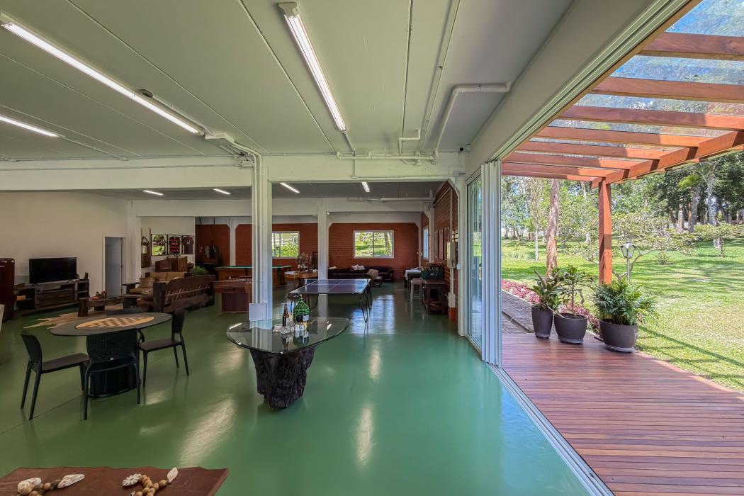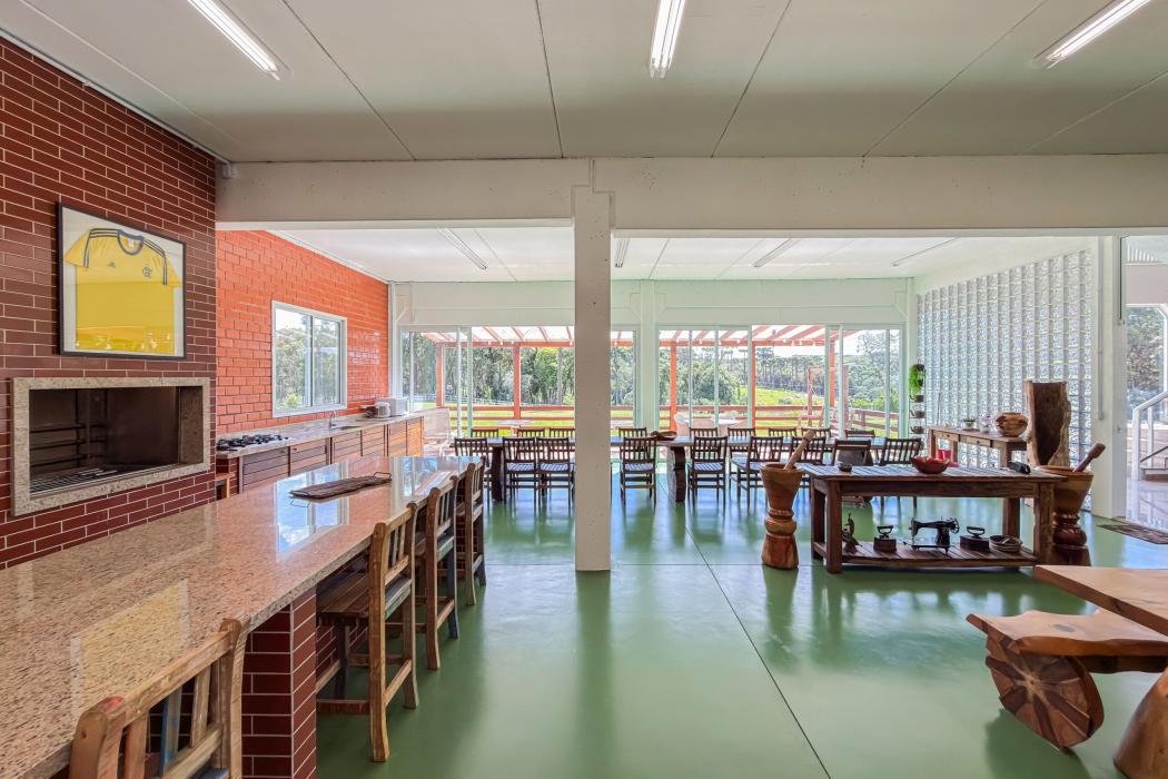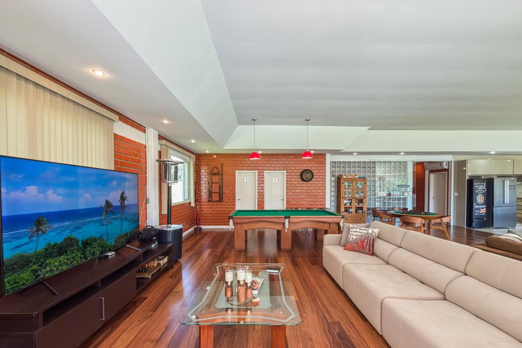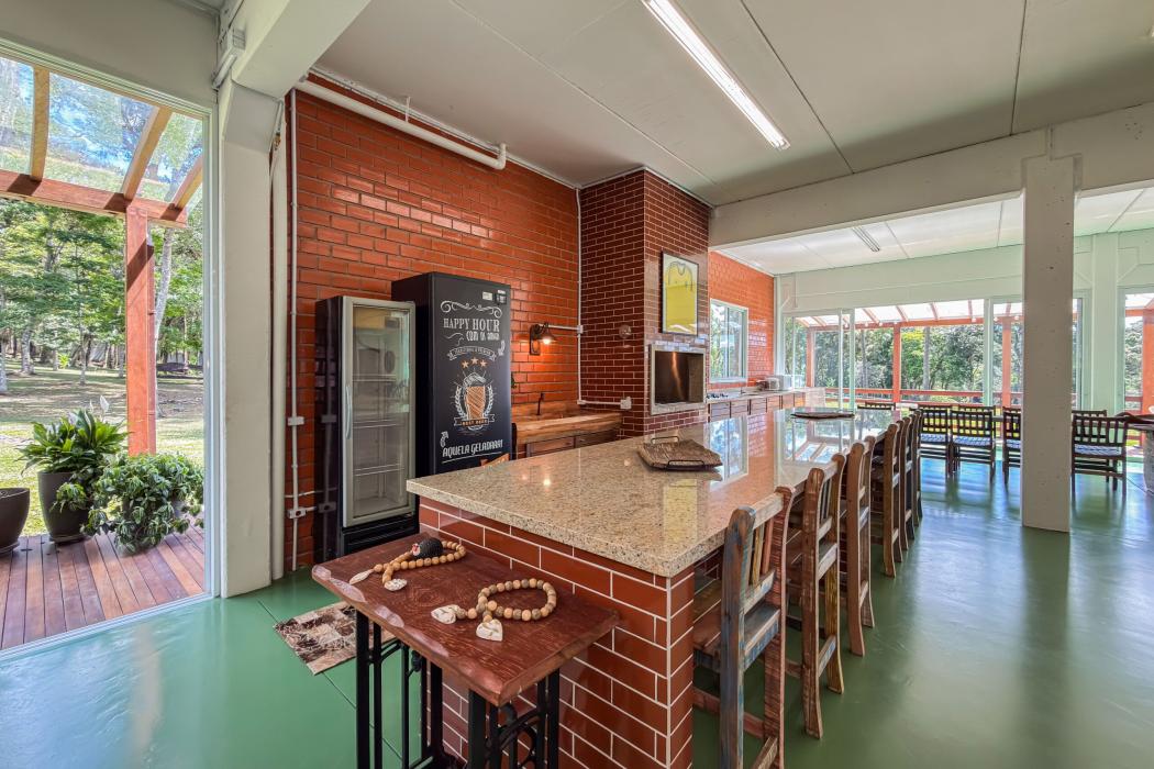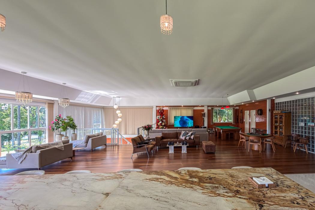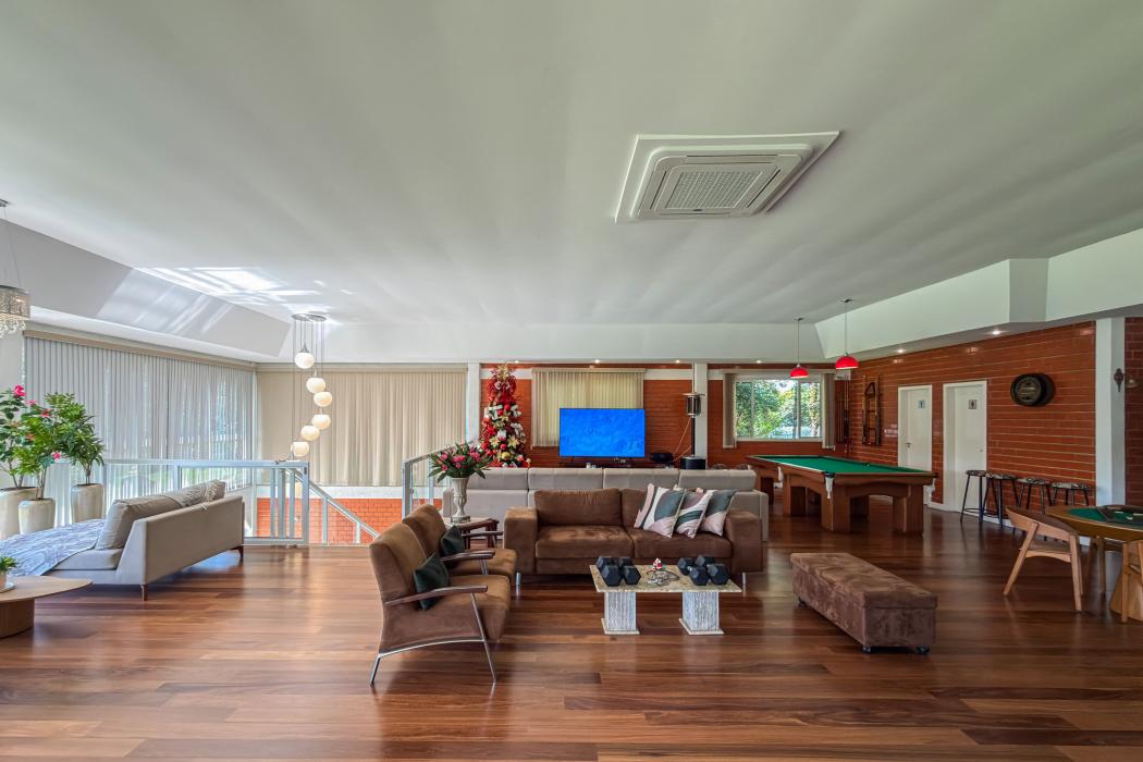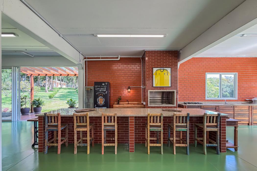 A área de lazer principal, no pavimento inferior, foi projetada para receber em grande escala. Conta com espaço gourmet com churrasqueira, salão amplo integrado, mesas de sinuca, ping-pong e jogos, além de mobiliário rústico de alta qualidade. Um espaço preparado para receber 30, 40 ou até 50 pessoas, com conforto e circulação inteligente.