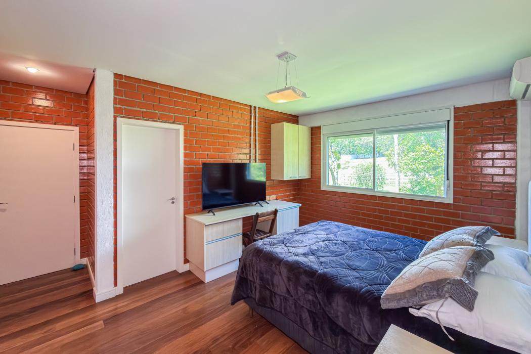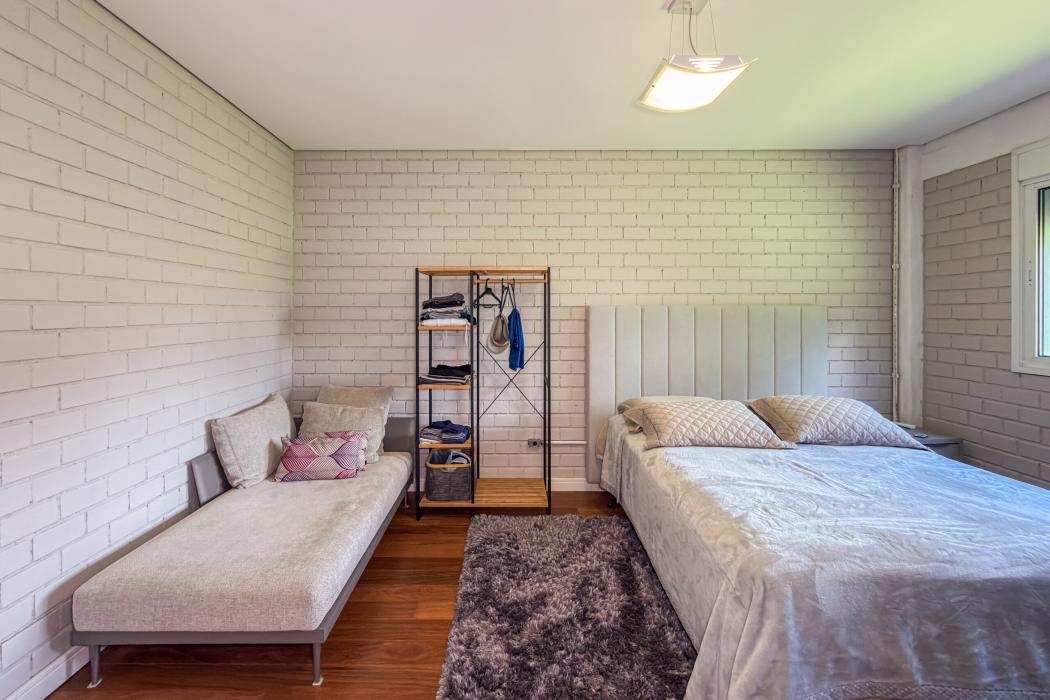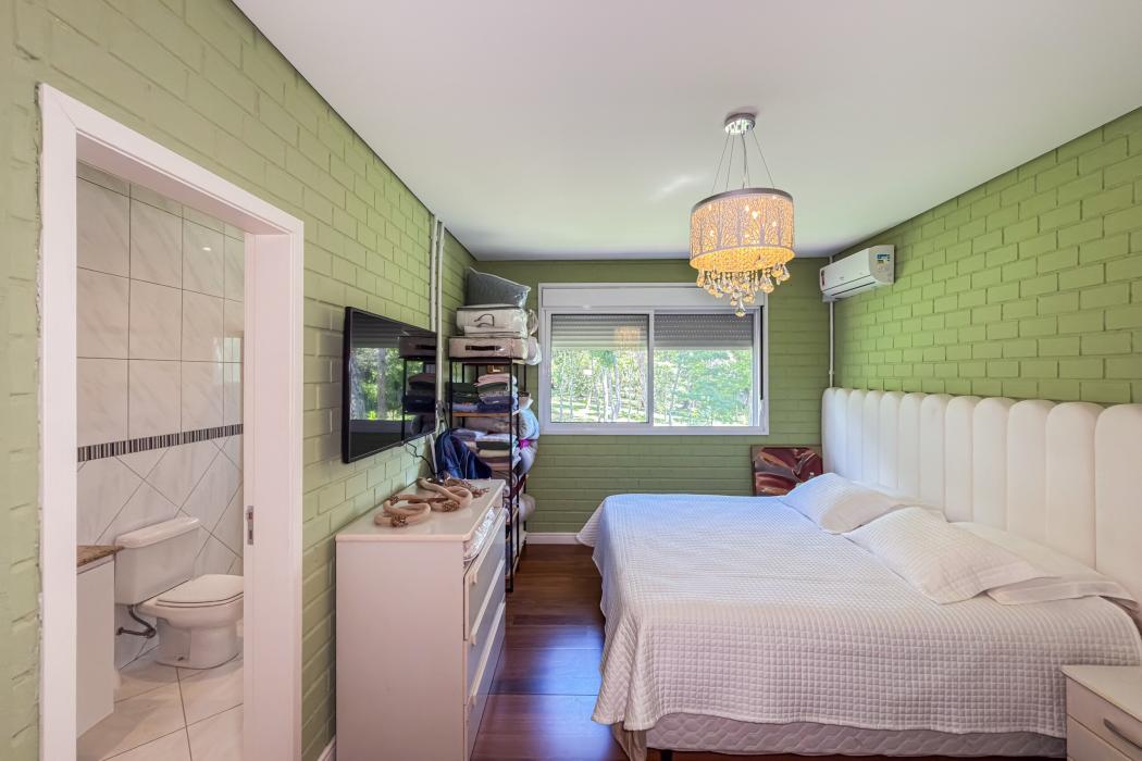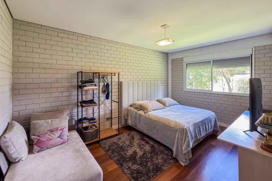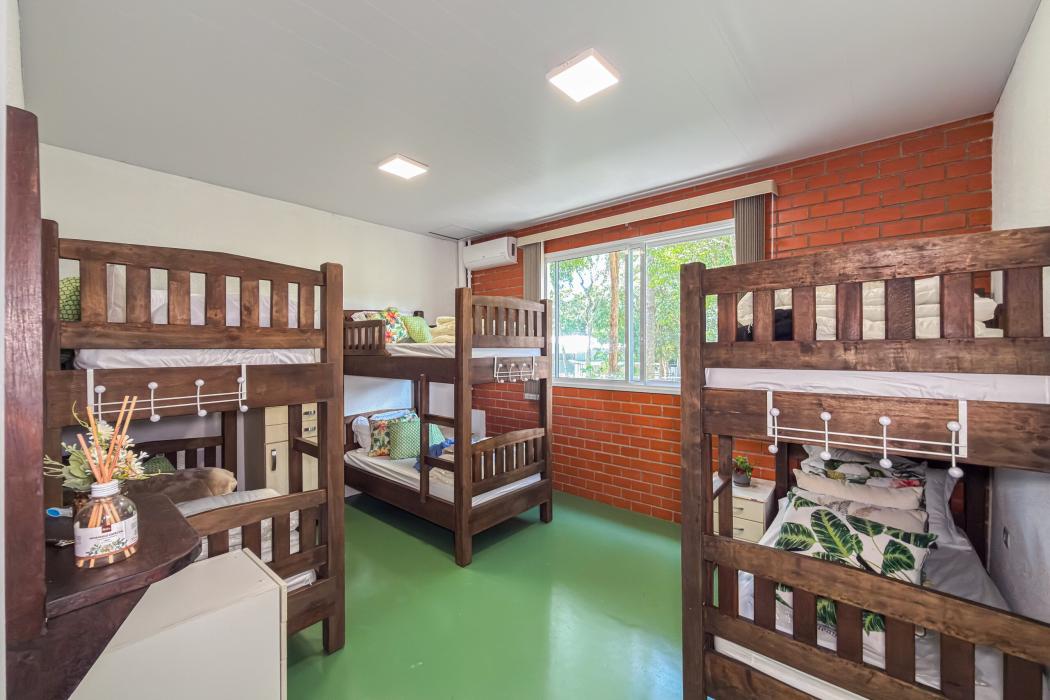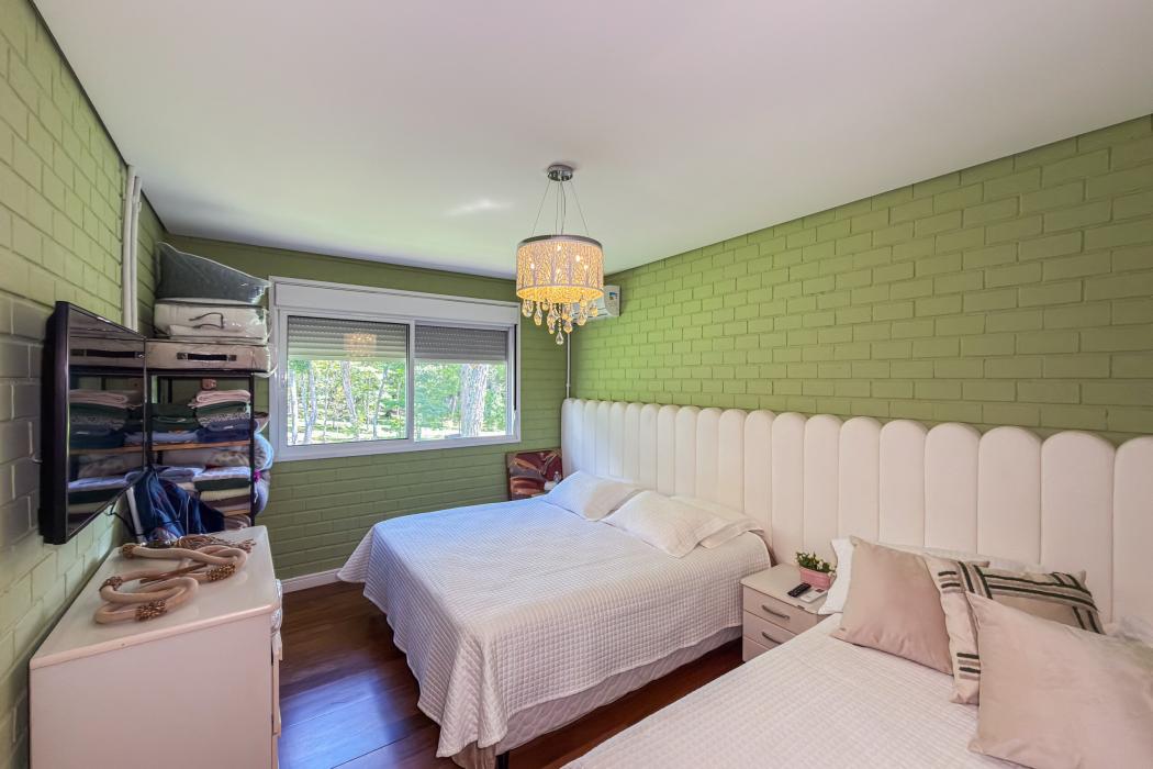 Além das suítes, a casa conta ainda com um dormitório amplo equipado com quatro beliches, ideal para acomodar hóspedes, crianças ou grupos, mantendo organização e funcionalidade sem comprometer o padrão do imóvel.