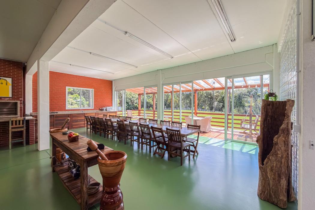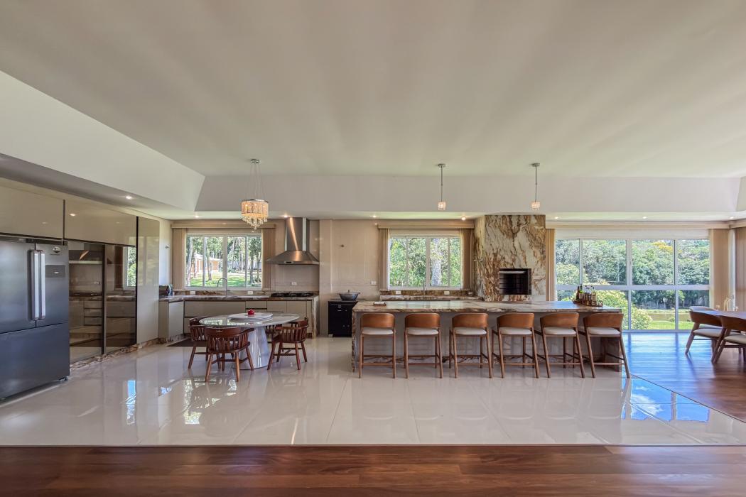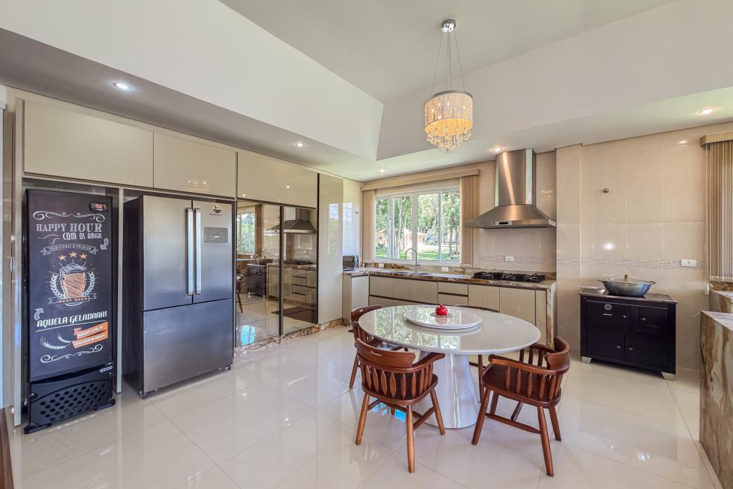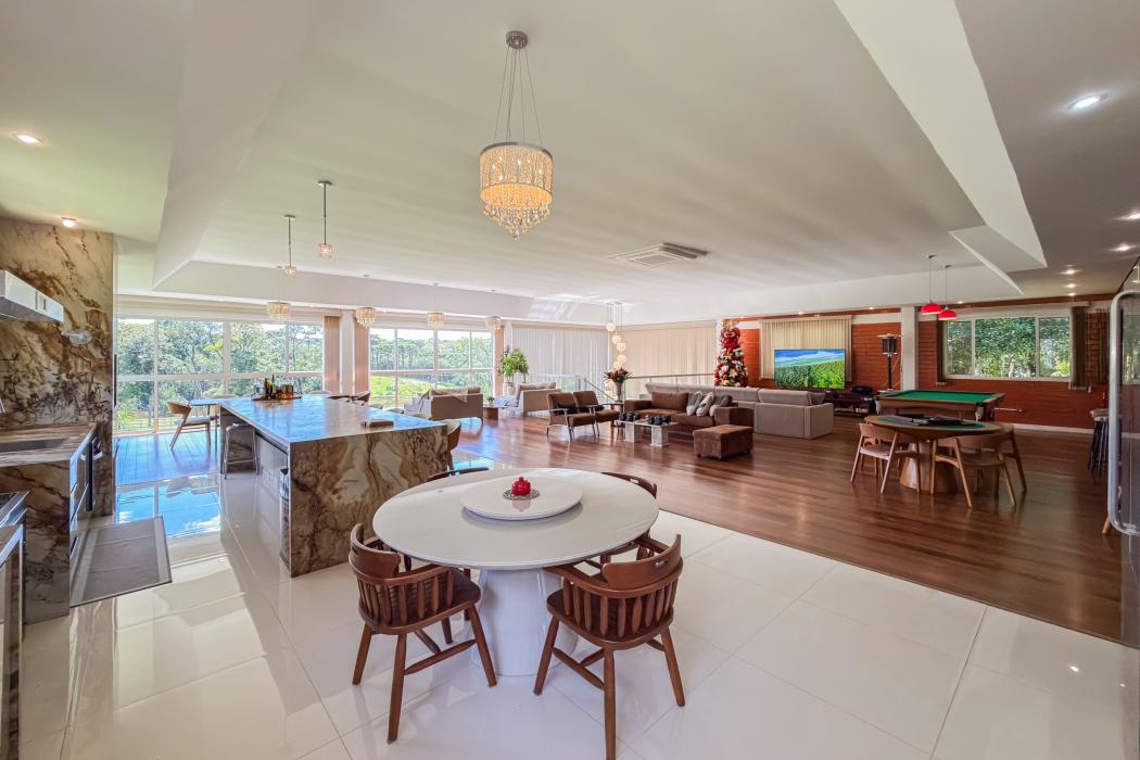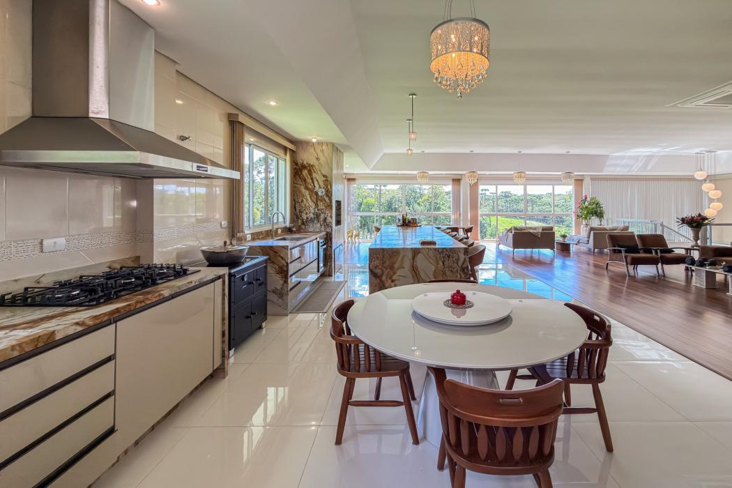 uma cozinha gourmet completa, planejada, mobiliada e equipada com churrasqueira, integrada a uma ampla sala de jantar. Um ambiente pensado para reunir família e convidados com conforto, enquanto o lazer acontece de forma fluida e elegante.