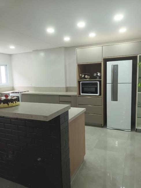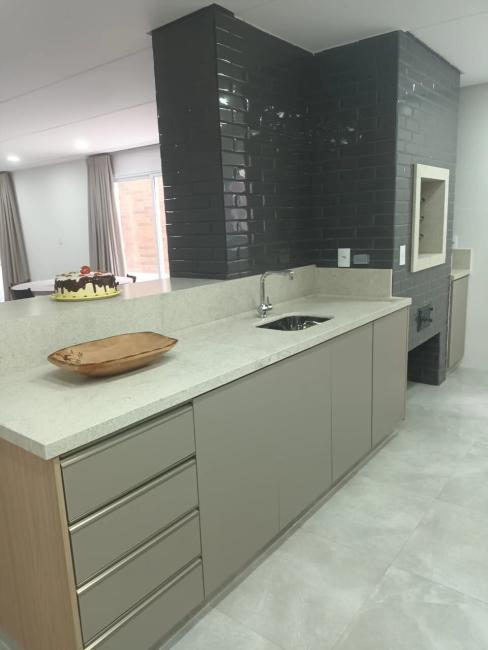 Salão de festas equipado com eletrodomésticos e churrasqueira