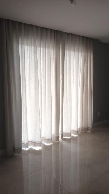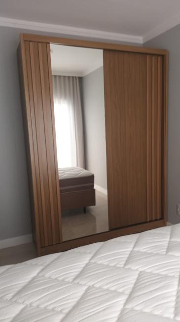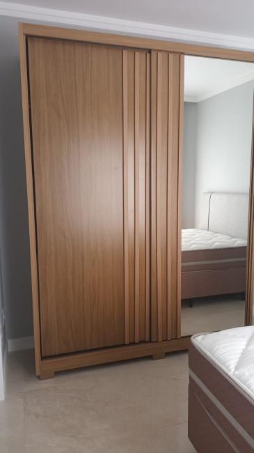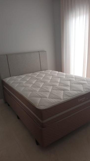 Suíte: Cama box de casal com painel de cabeceira, Colchão, Guarda-roupas, Cortinas, sacada.