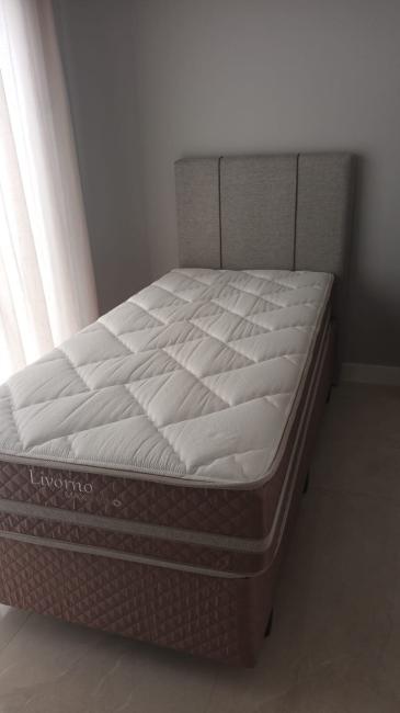 2 Quartos: cama box de solteiro com painel de cabeceira, colchão, guarda-roupas e Cortinas (tecido).