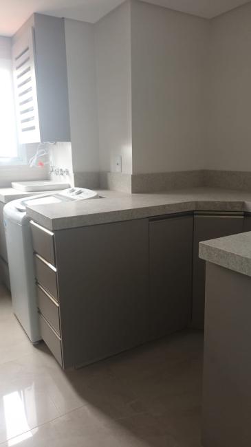 Cozinha: geladeira, fogão (quatro bocas), micro-ondas, armários instalados, pia com bancada de granito, aquecedor de gás (GLP).