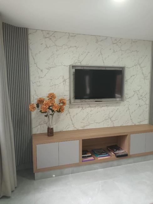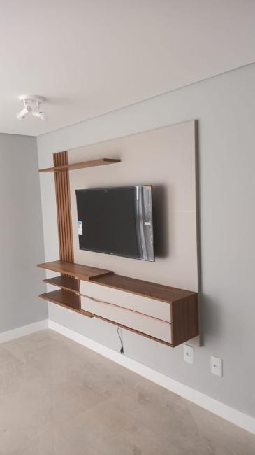 Sala de Estar e Jantar: TV 41 polegadas fixada em painel decorativo, sofá bipartido, cortinas (tecido), sacada com churrasqueira.