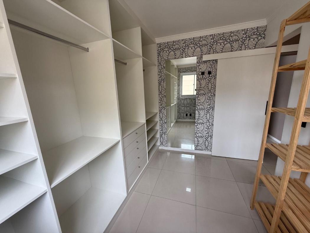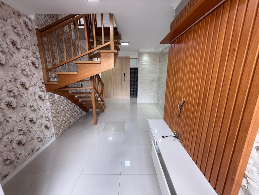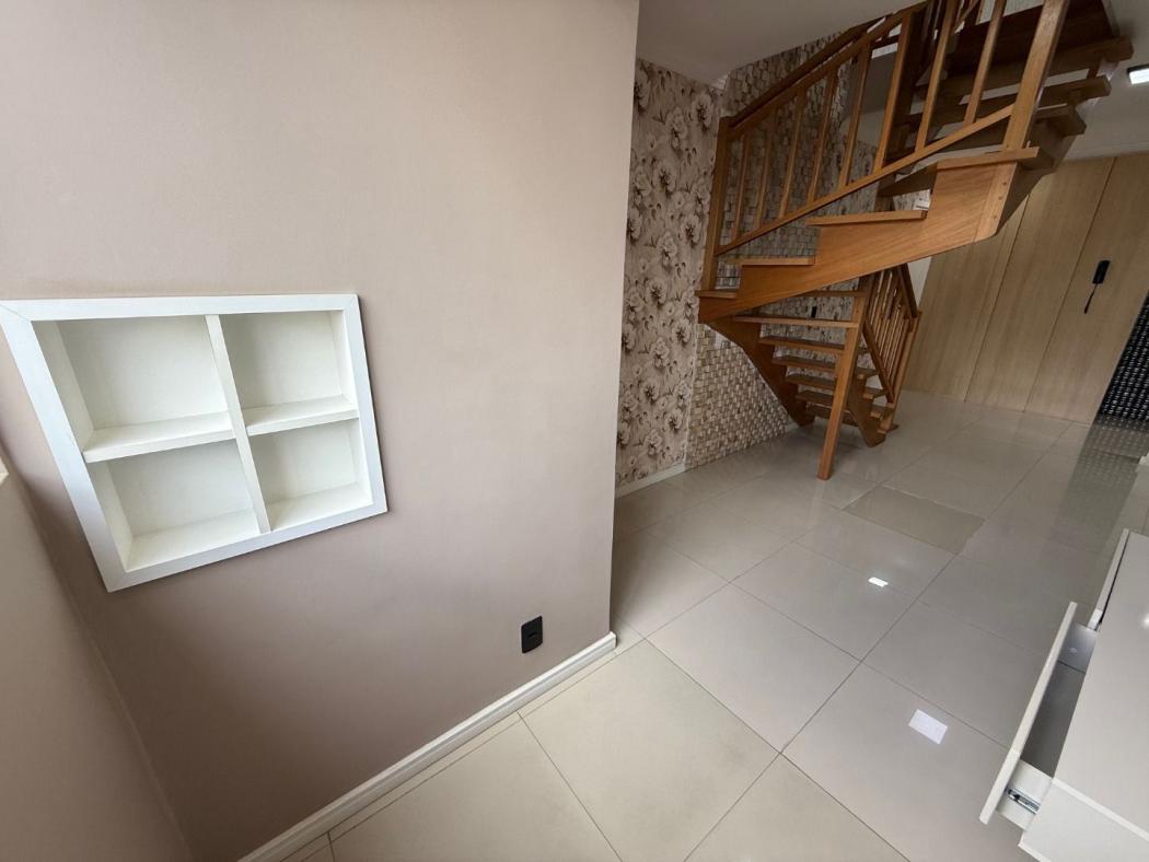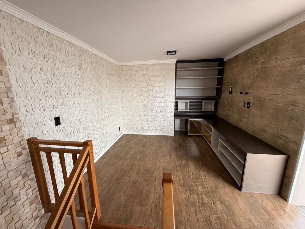 Pavimento inferior possui sala para 2 ambientes toda com sanca em gesso e espelho, painel de tv, sacada integrada a sala com churrasqueira, cozinha toda montada com armários embutidos com pia e tampo em granito com fogão cook top, corredor possui o banheiro social com box em vidro temperado com nicho, e ducha, 3 quartos sendo 1 suíte, o quartos de solteiro e 1 dos quartos com armários, a suíte possui painel de TV com gaveteiros, a janelas dos quartos todas com persianas embutidas, sala com cortina sob medida, a escada e toda em madeira maciça.