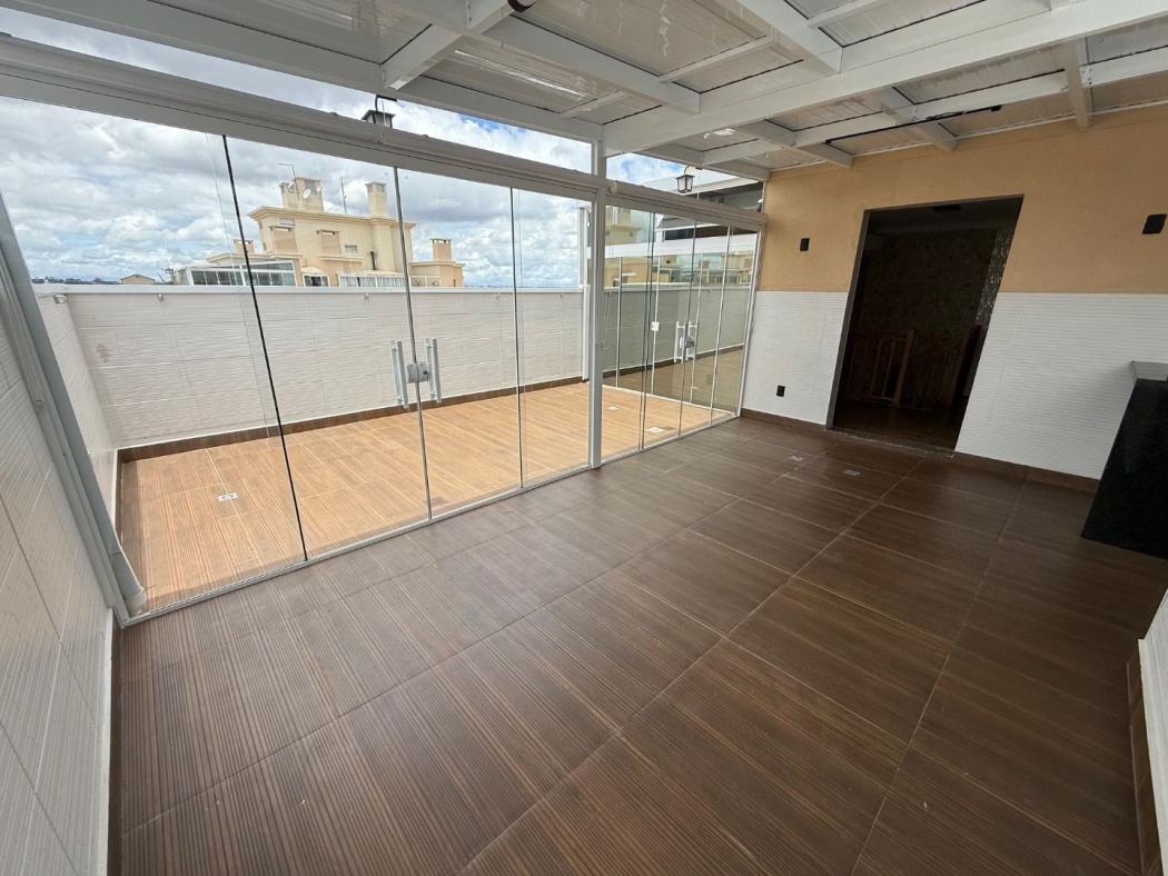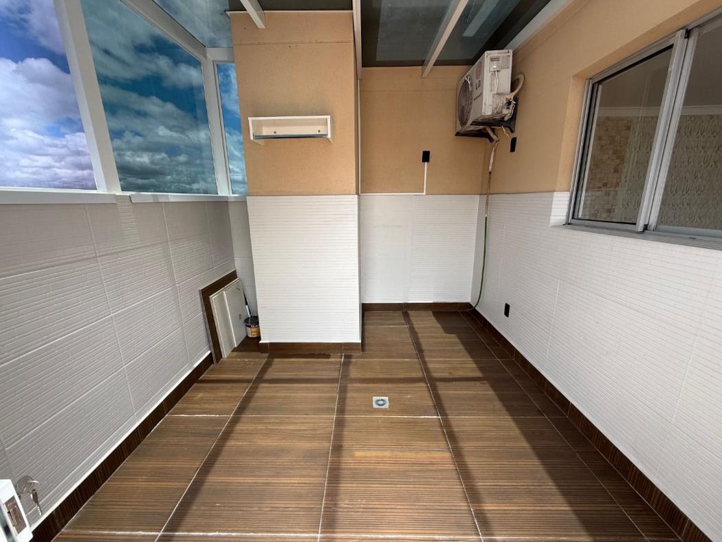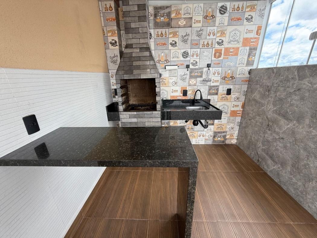 Pavimento superior possui sala intima com armários, ar condicionado, ampla área de lazer coberta e fechada em vidro com churrasqueira, pia e balcão em granito, depósito fechado em vidro e área aberta.