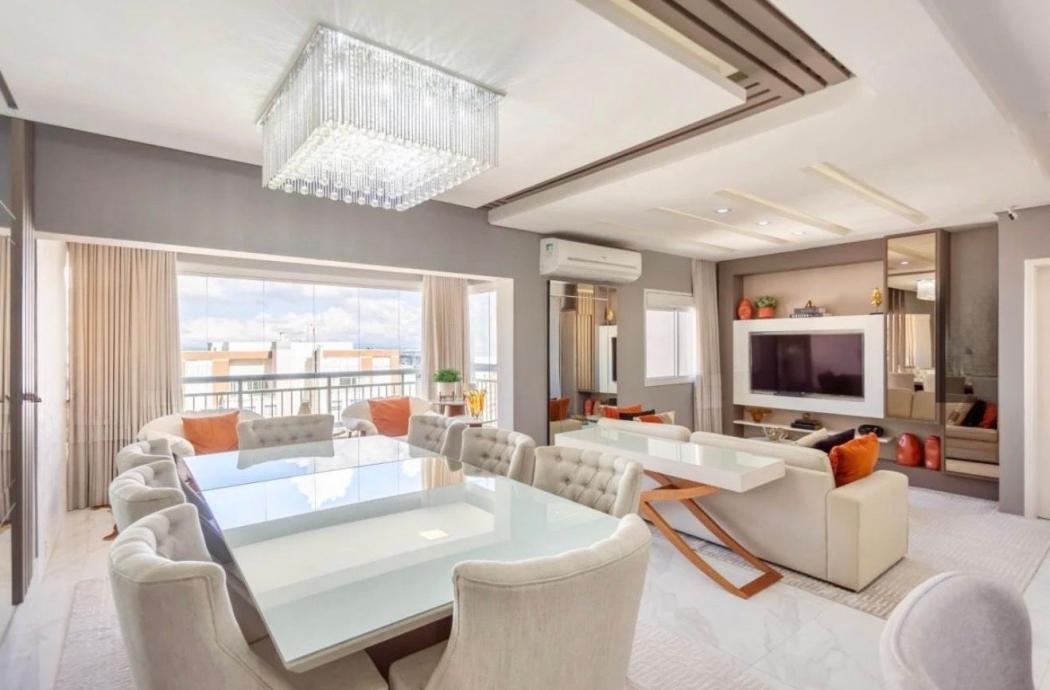 São 328m² privativos, totalmente planejados, com peças de design, iluminação sofisticada e acabamentos de altíssimo padrão.
