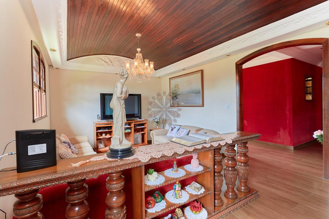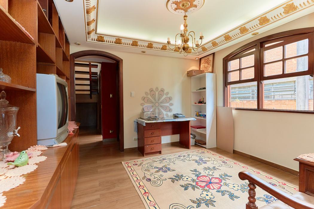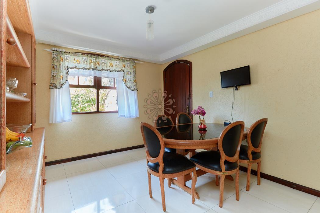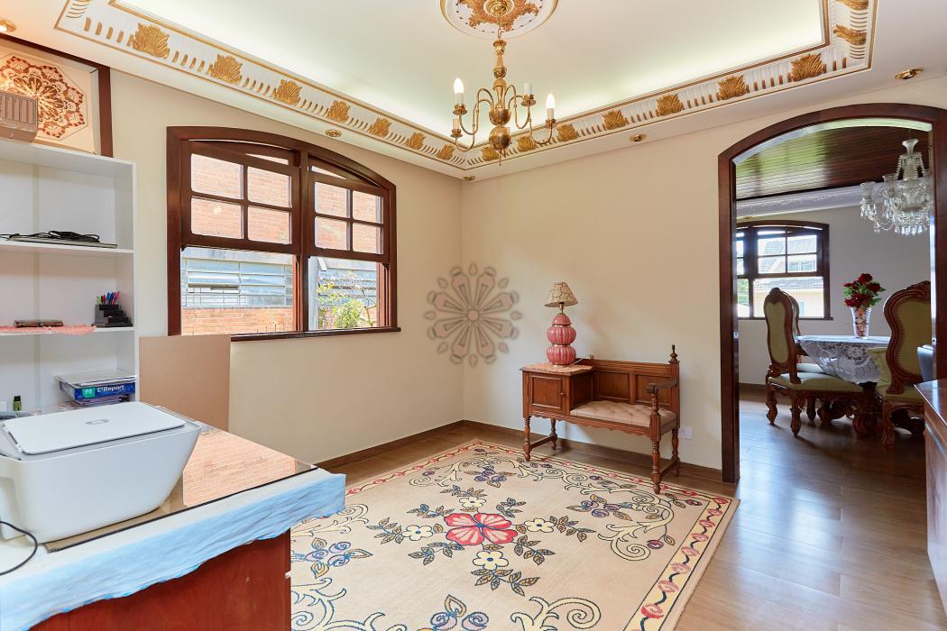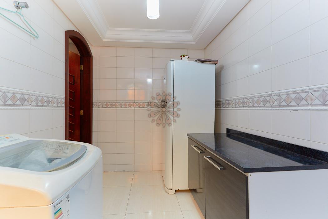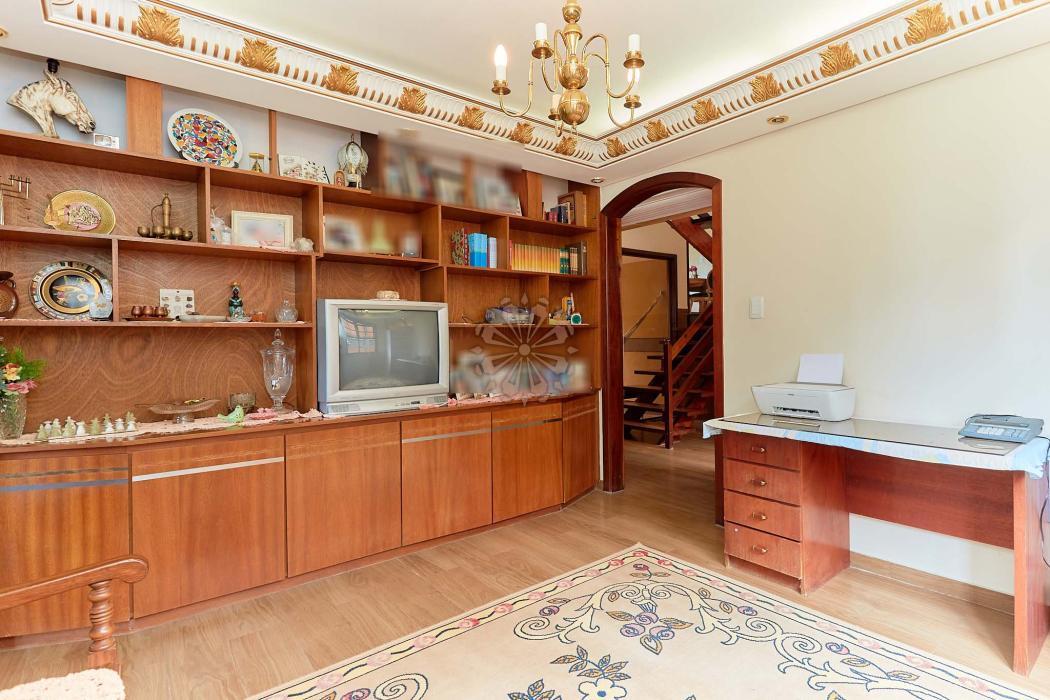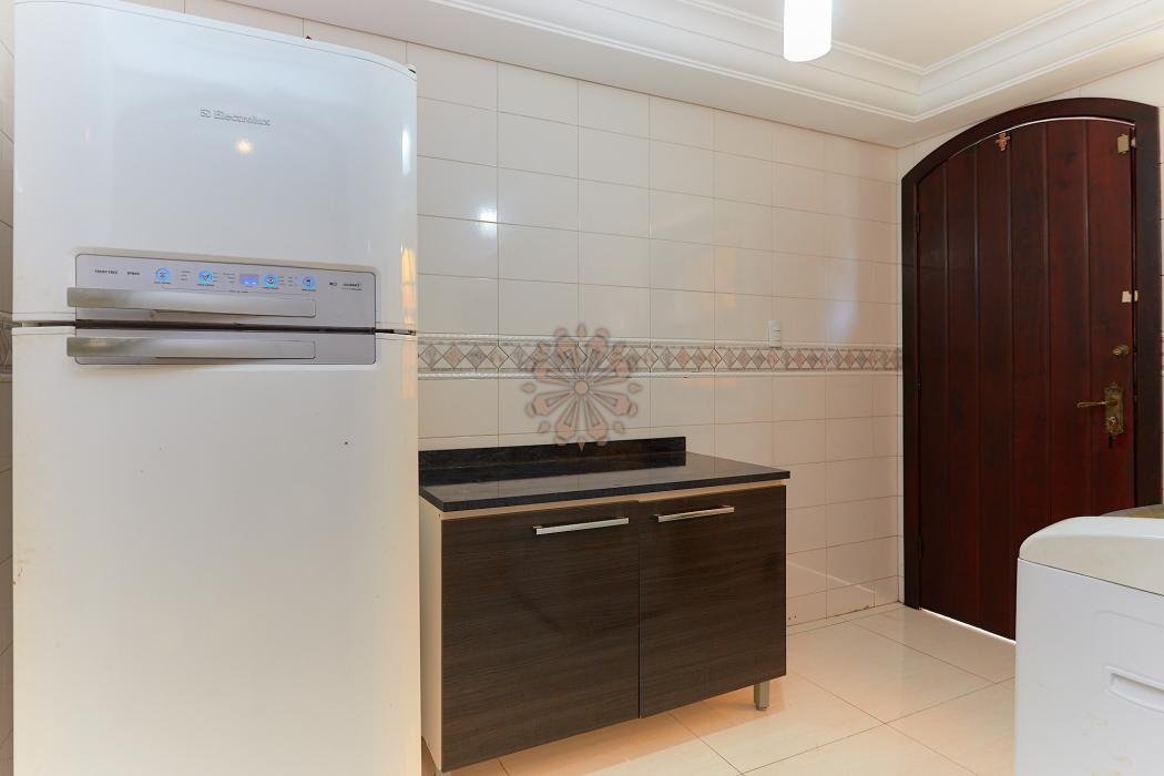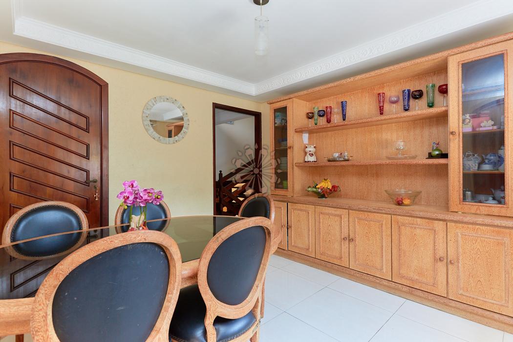 A residência possui 268,71 m² averbados e conta com sala de estar e jantar em desnível, bar ou adega, sala de TV, escritório, varanda e banheiro social. Na área íntima, dispõe de quatro dormitórios com armários planejados, sendo uma suíte com banheira de hidromassagem. A cozinha é planejada e integrada à copa, contando também com despensa e lavanderia. Na parte externa, há churrasqueira e canil.
