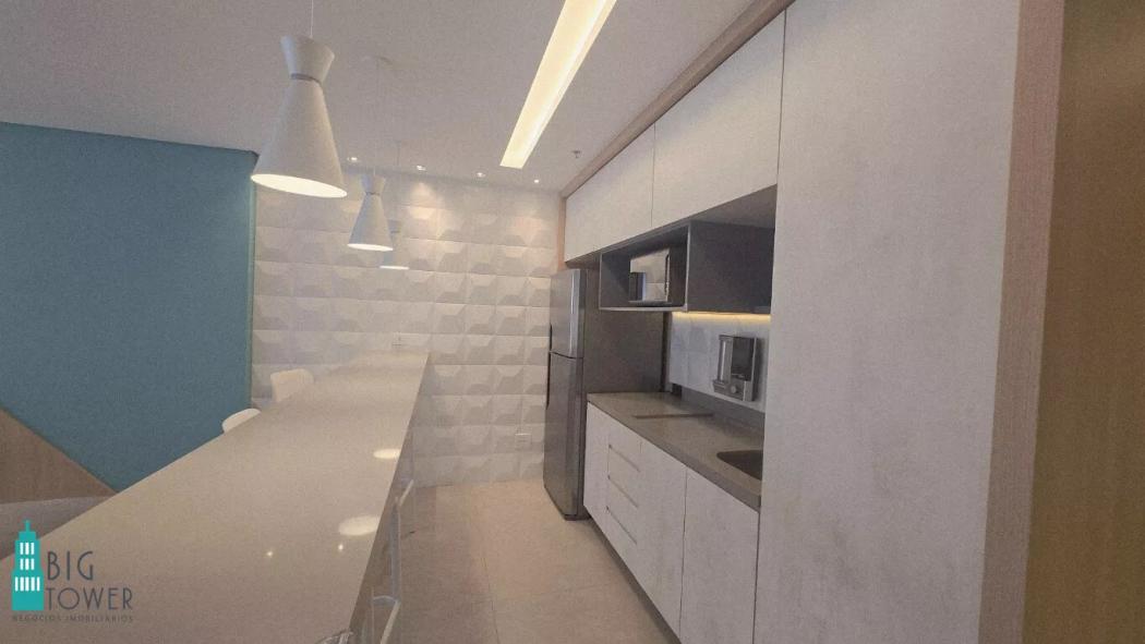 - Cozinha Equipada: Geladeira, microondas e mesa tipo bancada para você se sentir em casa.