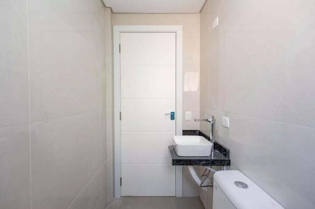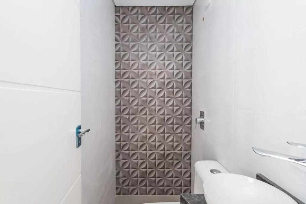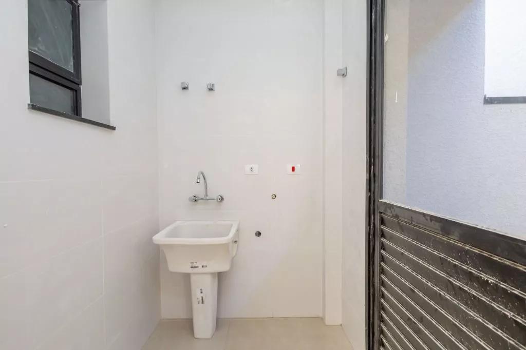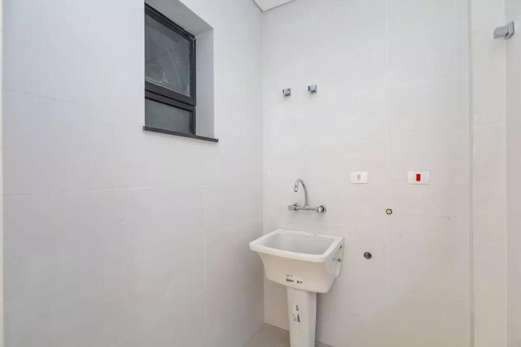 Revestimento da parede da cozinha, lavanderia e banheiros em cerâmica branca.