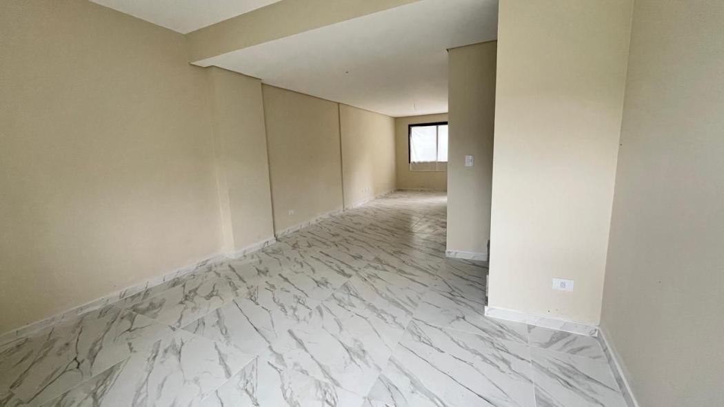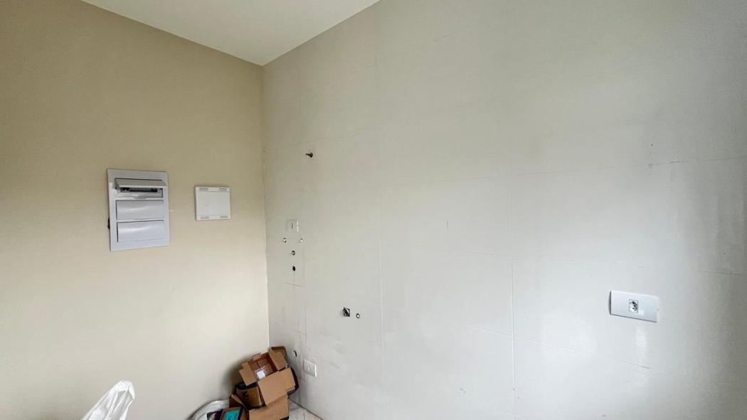 Sala para 2 ambientes integrada com cozinha, lavabo, área de serviço, quintal, onde é possível colocar churrasqueira.