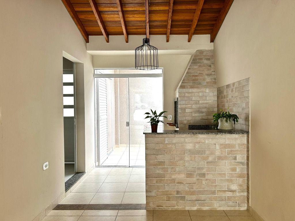 * Cozinha integrada à área gourmet, com churrasqueira e pia
