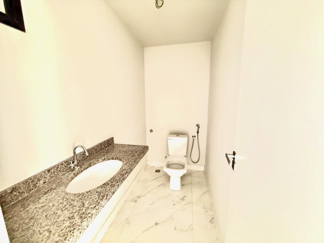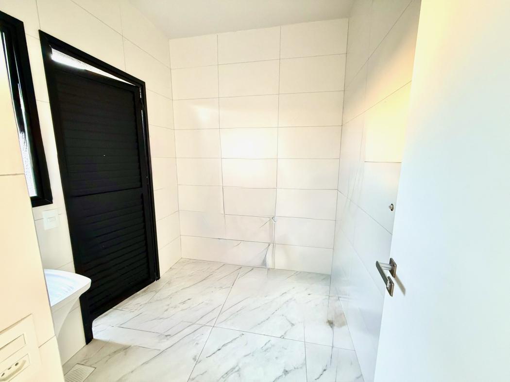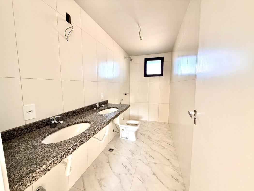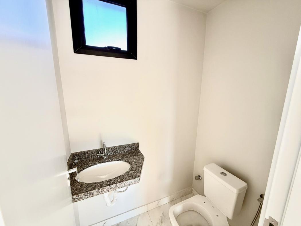 No piso superior, a área íntima conta com suíte master, banheiro com duas cubas, além de dois dormitórios e sacada técnica, garantindo conforto e privacidade.